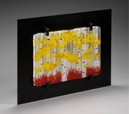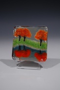 These fused glass tiles are a combination of sheet glass, glass paints and glass frits. They are fired multiple times at different temperatures to achieve varied textures. The tiles are then mounted on a mirror and placed in a frame in different ways depending on their size.